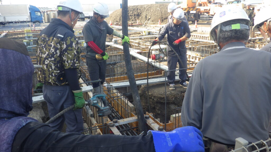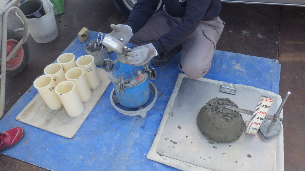 打設前にはコンクリートのスランプ試験と空気量試験を実施しました。